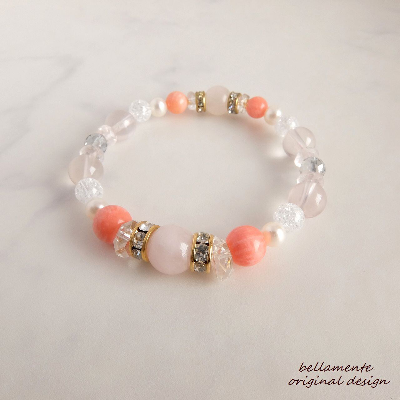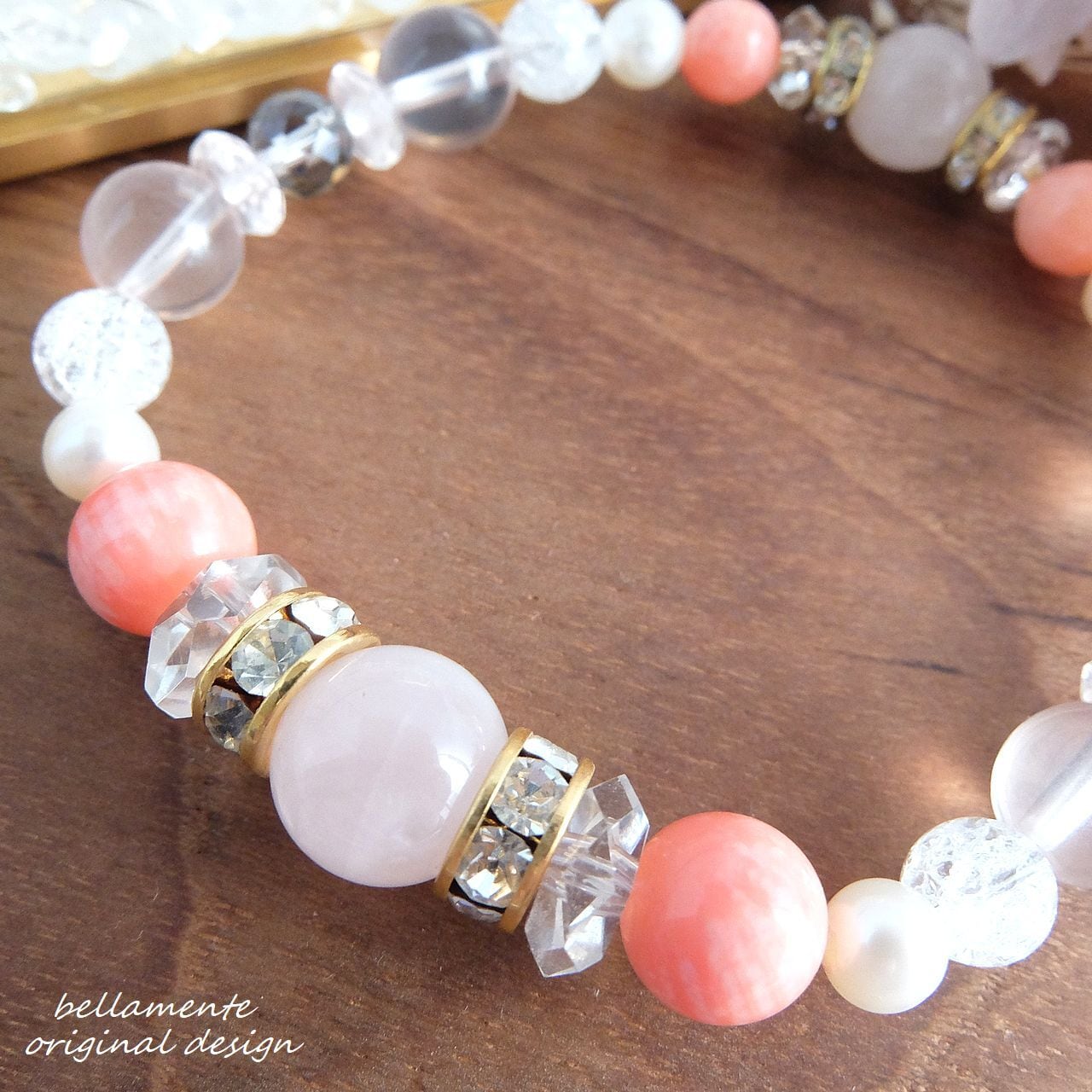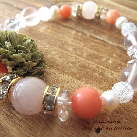美しさと穏やかさが共存するパワーストーンブレスレット「Charming」。コーラル、淡水パール、ローズクオーツの天然石を贅沢に使用した、上品で華やかなデザインです。